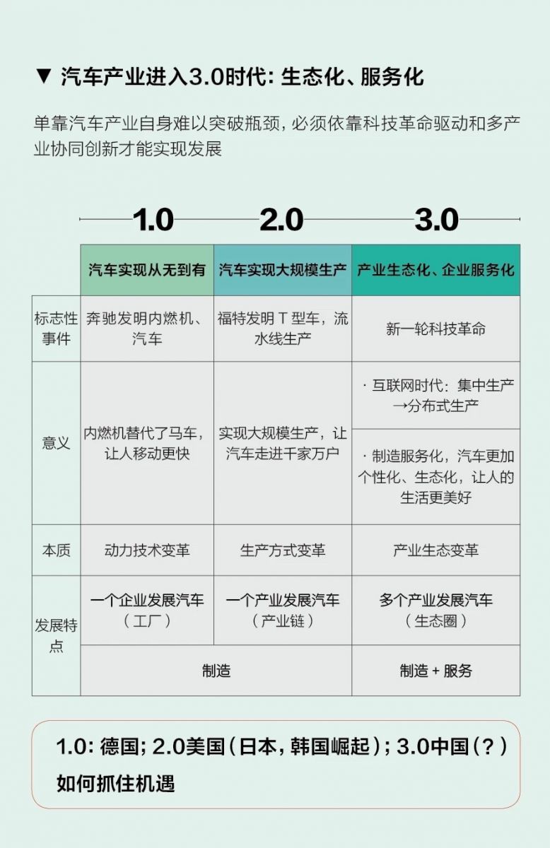 汽車(chē)產(chǎn)業(yè)進(jìn)入3.0時(shí)代,呈現(xiàn)出產(chǎn)業(yè)生態(tài)化、企業(yè)服務(wù)化的特征,形成多個(gè)產(chǎn)業(yè)發(fā)展汽車(chē)的生態(tài)圈。