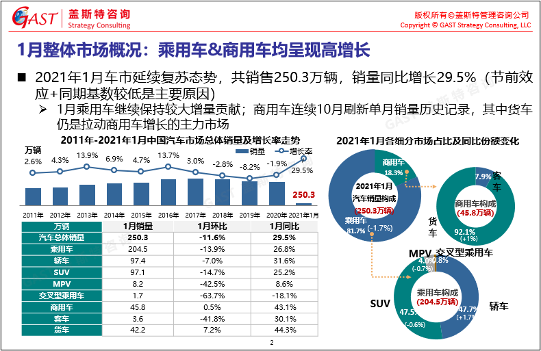 1月整體市場(chǎng)概況:乘用車和商用車均呈現(xiàn)高增長(zhǎng)態(tài)勢(shì);其中乘用車?yán)^續(xù)保持較大增量貢獻(xiàn),而以重卡為主要增量的貨車市場(chǎng)對(duì)商用車消費(fèi)的貢獻(xiàn)作用進(jìn)一步放大。
