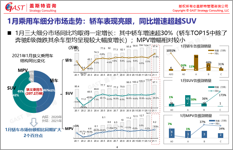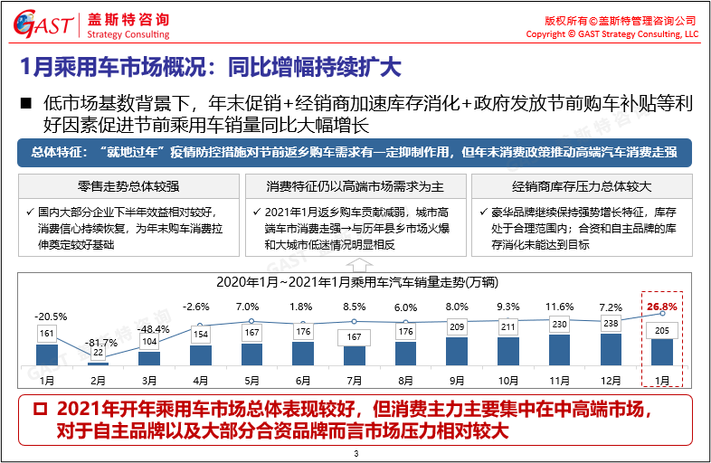 1月乘用車市場(chǎng)概況:在低基數(shù)背景下,年末消費(fèi)等利好政策推動(dòng)節(jié)前乘用車銷量同比大幅增長(zhǎng),而消費(fèi)主力主要集中在中高端市場(chǎng)。