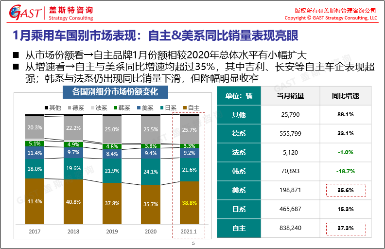 1月乘用車國(guó)別市場(chǎng)表現(xiàn):自主和美系銷量表現(xiàn)亮眼,同比增速均超過(guò)35%,韓系與法系同比增速下滑,但降幅明顯收窄。