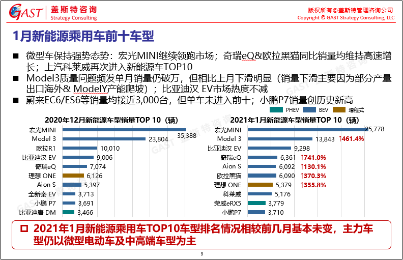 1月新能源乘用車前十車型:仍以微型電動(dòng)車及中高端車型銷量貢獻(xiàn)為主,其中宏光MINI、Model3和造車新勢(shì)力主力車型表現(xiàn)均較好。