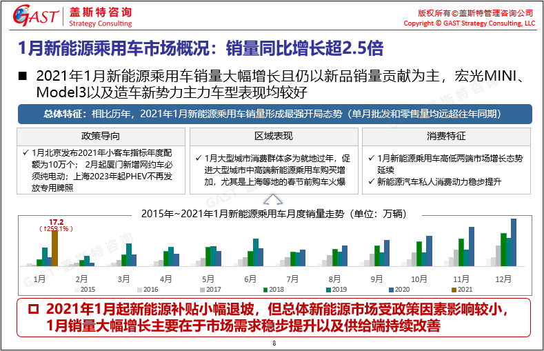 1月新能源乘用車市場(chǎng)概況:由于私人消費(fèi)需求穩(wěn)步提升及供給端持續(xù)改善,1月新能源乘用車市場(chǎng)大幅增長(zhǎng),銷量達(dá)17.2萬(wàn)輛且同比增長(zhǎng)超2.5倍。