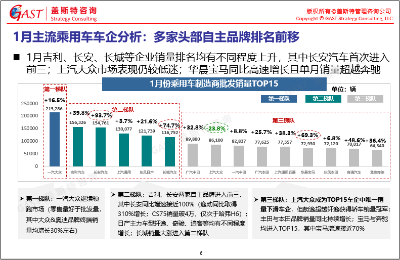 1月主流乘用車車企分析:長(zhǎng)安、長(zhǎng)城等多家頭部自主品牌銷量排名均有不同程度上升,而上汽大眾市場(chǎng)表現(xiàn)仍較低迷,成為TOP15車企中唯一銷量下滑的企業(yè)。