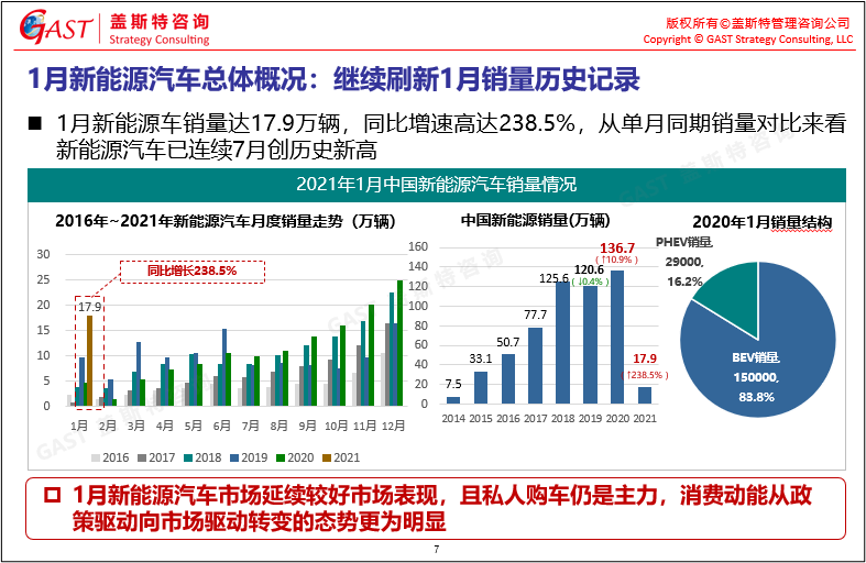 1月新能源汽車總體概況:1月新能源汽車銷量達(dá)17.9萬(wàn)輛,同比增速達(dá)238.5%,延續(xù)較好市場(chǎng)表現(xiàn),且私人購(gòu)車仍是主力,消費(fèi)動(dòng)能從政策驅(qū)動(dòng)向市場(chǎng)驅(qū)動(dòng)轉(zhuǎn)變態(tài)勢(shì)更為明顯。