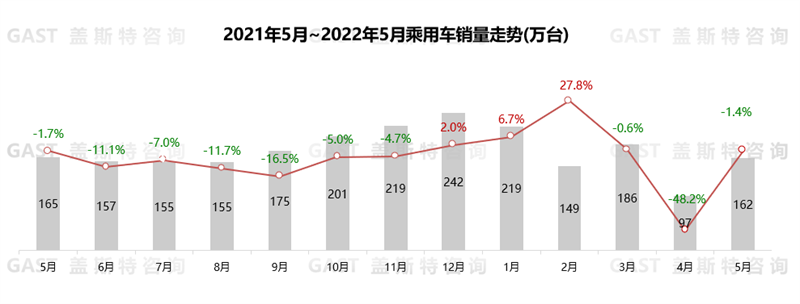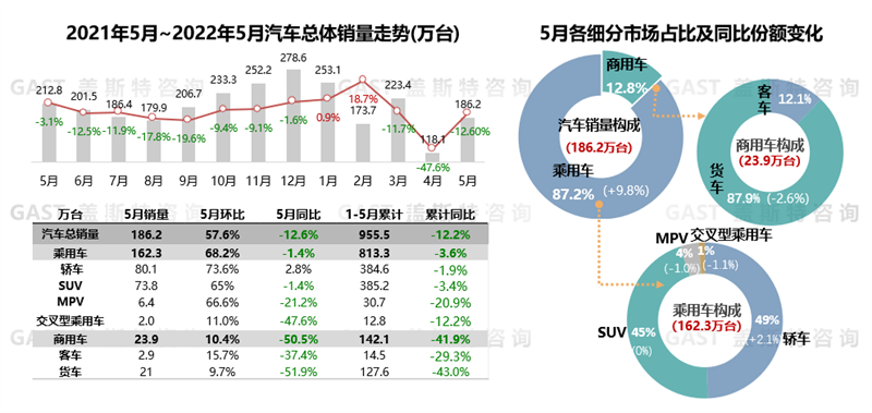 2022年5月,汽車(chē)市場(chǎng)銷(xiāo)售186.2萬(wàn)臺(tái),同比下降12.6%;1-5月累計(jì)銷(xiāo)售955.5萬(wàn)臺(tái),同比下降12.2%。多點(diǎn)疫情散發(fā)得到有效控制,汽車(chē)企業(yè)復(fù)工,物流、供貨情況大幅好轉(zhuǎn),產(chǎn)能逐步恢復(fù),產(chǎn)銷(xiāo)呈恢復(fù)性增長(zhǎng)。本報(bào)告圍繞5月份中國(guó)車(chē)市銷(xiāo)量走勢(shì)與車(chē)市熱點(diǎn)進(jìn)行研究分析。