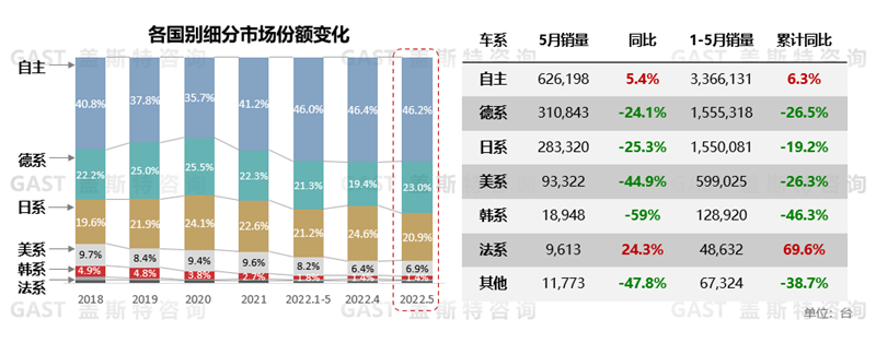 5月,自主品牌市場(chǎng)份額46.2%,相比上月下降0.2個(gè)百分點(diǎn)。除自主、法系同比增長(zhǎng)外,其他系別均有不同程度下滑。德系份額環(huán)比上升,主要與一汽大眾恢復(fù)生產(chǎn)、加強(qiáng)供貨有關(guān)。日系份額環(huán)比下滑,主要是本田、日產(chǎn)下滑較大。