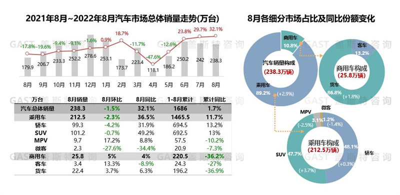 2022年8月,汽車市場(chǎng)銷售238.3萬(wàn)臺(tái),同比增長(zhǎng)32.1%,保持良好發(fā)展態(tài)勢(shì);1-8月累計(jì)銷售1686萬(wàn)臺(tái),同比下降1.7%。國(guó)家購(gòu)置稅減免政策及各地方的促消費(fèi)政策持續(xù)見效,消費(fèi)端呈現(xiàn)良好態(tài)勢(shì),市場(chǎng)有望保持增長(zhǎng)勢(shì)頭。本報(bào)告圍繞8月份中國(guó)車市銷量走勢(shì)進(jìn)行研究分析。