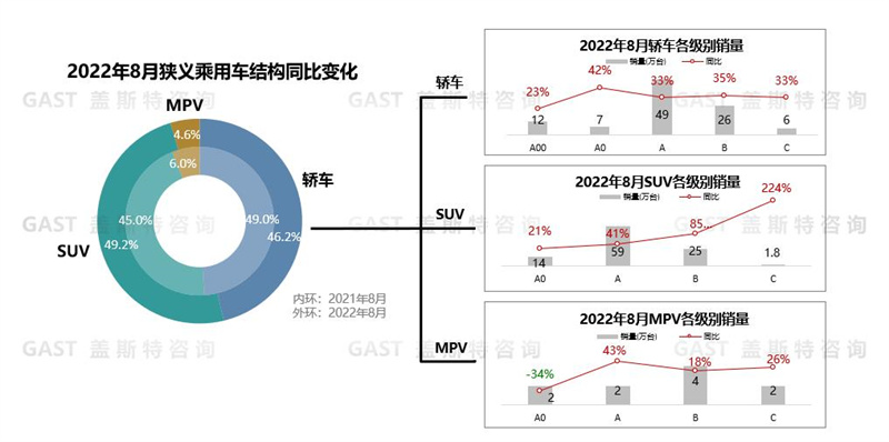 三大品類均實(shí)現(xiàn)增長(zhǎng),其中轎車同比增長(zhǎng)31.9%,SUV同比增長(zhǎng)49.2%,MPV同比增長(zhǎng)8.8%。結(jié)構(gòu)方面,除A0-MPV下滑外,其余細(xì)分市場(chǎng)均實(shí)現(xiàn)增長(zhǎng)。