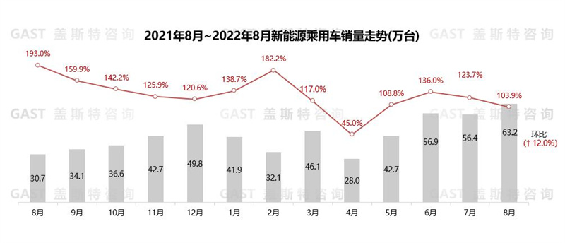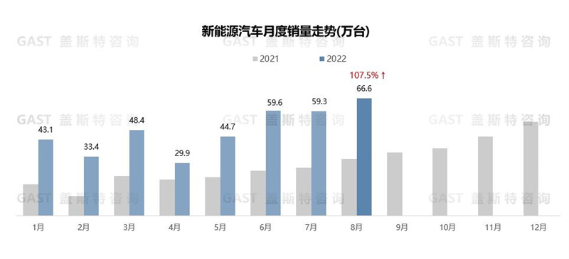 在汽車消費(fèi)政策助推下,8月新能源汽車市場(chǎng)延續(xù)高增長(zhǎng)態(tài)勢(shì),月銷量創(chuàng)歷史新高:共銷售66.6萬(wàn)臺(tái),同比增長(zhǎng)107.5%,環(huán)比增長(zhǎng)12.4%。新能源滲透率明顯提升,全市場(chǎng)滲透率達(dá)27.9%。