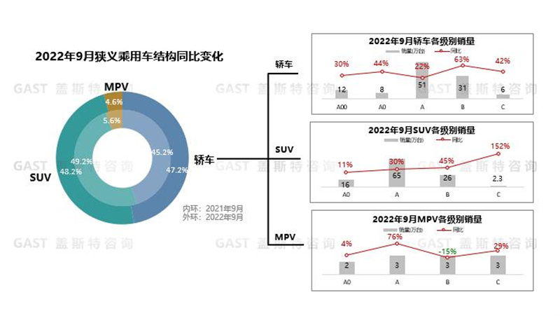三大品類均實現(xiàn)增長,其中轎車同比增長38%,SUV同比增長30.5%,MPV同比增長10.5%。細分市場方面,除B級MPV下滑外,其余細分市場均實現(xiàn)增長。