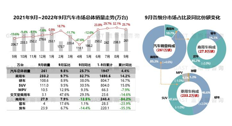 2022年9月,汽車市場銷售261萬臺,同比增長25.7%,繼續(xù)保持良好發(fā)展態(tài)勢;1-9月累計銷售1947萬臺,同比增長4.4%。得益于購置稅優(yōu)惠等促消費政策持續(xù)發(fā)力,疊加消費旺季因素,預(yù)計整體汽車市場增長勢頭還將延續(xù)。本報告圍繞9月份中國車市銷量走勢進行研究分析。