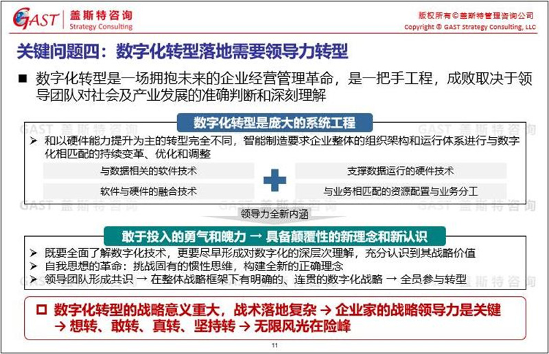 第四,數(shù)字化轉(zhuǎn)型落地需要領(lǐng)導(dǎo)力轉(zhuǎn)型。數(shù)字化轉(zhuǎn)型是一場擁抱未來的企業(yè)經(jīng)營管理革命,是“一把手工程”。數(shù)字化轉(zhuǎn)型的戰(zhàn)略意義重大,戰(zhàn)術(shù)落地卻非常復(fù)雜。轉(zhuǎn)型成敗與否,一方面取決于領(lǐng)導(dǎo)團(tuán)隊對社會變革及產(chǎn)業(yè)發(fā)展的準(zhǔn)確判斷、深刻理解;另一方面在于企業(yè)家的戰(zhàn)略領(lǐng)導(dǎo)力,企業(yè)家是否想轉(zhuǎn)型、敢轉(zhuǎn)型、真轉(zhuǎn)型和堅持轉(zhuǎn)型,是關(guān)鍵所在。