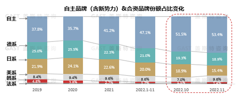 2022年中國品牌份額創(chuàng)新高,第四季度已突破50%,全年約達47%。具體來看,中國車企市場份額的增長主要由新能源產(chǎn)品拉動;除純電動車外,比亞迪、長城、吉利等多家車企推出PHEV產(chǎn)品,加速搶占燃油車市場;頭部傳統(tǒng)和新勢力車企持續(xù)發(fā)力高端市場,擠壓一線及豪華合資品牌的份額。各國合資品牌份額集體下滑,整體相比去年下降6個百分點至53%。其中,德系同比下滑約1個百分點,電動車銷量不及預期;日系同比下滑約2.6個百分點,主要受中國品牌新能源產(chǎn)品沖擊。