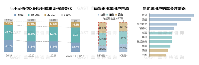 2022年中高端市場份額持續(xù)提升,低端車型份額下滑。其中,20萬元以上車型占比達到25%,同比增加1.8個百分點;10萬元以下車型占比首次小于三成。用戶特征方面,增換購用戶占比超50%,且購買高端新能源產(chǎn)品的增換購用戶占比明顯高于燃油車;90后年輕用戶成為主流消費人群,獨立消費意識增強,對于電動化智能化新技術(shù)及新服務模式更加認同;消費者購車時更關(guān)注產(chǎn)品本身而非品牌知名度,傳統(tǒng)汽車品牌的影響力逐漸降低。