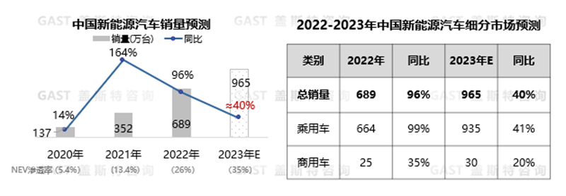 蓋斯特判斷:2023年新能源市場(chǎng)仍將保持較大增量,但增速有所放緩,預(yù)計(jì)全年銷量可達(dá)965萬輛左右,同比增長(zhǎng)約40%;滲透率有望從2022年的26%提升至35%左右。其中,新能源乘用車將與整體增長(zhǎng)速度同步,預(yù)計(jì)銷量將達(dá)到約935萬輛。從細(xì)分市場(chǎng)看,10-20萬元的主流市場(chǎng)銷量將達(dá)400萬輛;20萬元以上的中高端市場(chǎng),由于增換購用戶占比增加,銷量有望達(dá)到320萬輛。新能源商用車總體規(guī)模依然較小,但在雙碳目標(biāo),環(huán)保、治超,以及路權(quán)政策三重因素的影響下,預(yù)計(jì)2023年整體滲透率將升至9%。