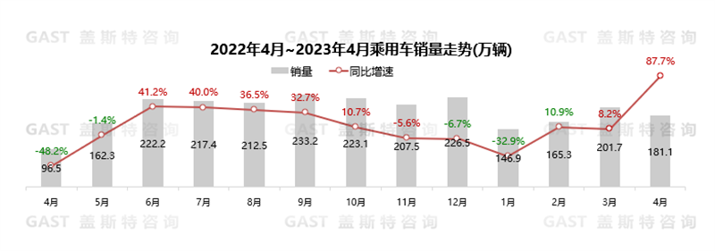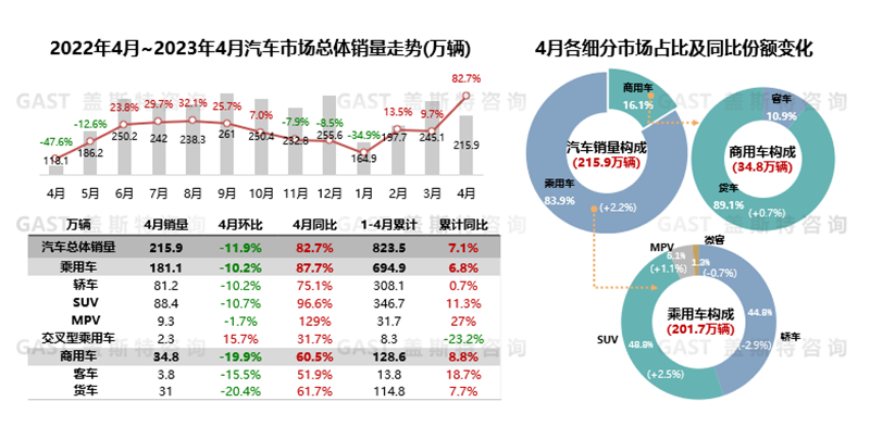 2023年4月,中國汽車市場銷售215.9萬臺,同比增長82.7%,環(huán)比下降11.9%;1-4月累計銷售823.5萬輛,同比增長7.1%。因去年疫情影響導致同期基數(shù)較低,4月同比大幅增長;但從環(huán)比數(shù)據(jù)來看,價格戰(zhàn)后消費者觀望心理持續(xù),汽車消費需求待進一步釋放。本報告圍繞4月份中國車市銷量走勢進行研究分析。