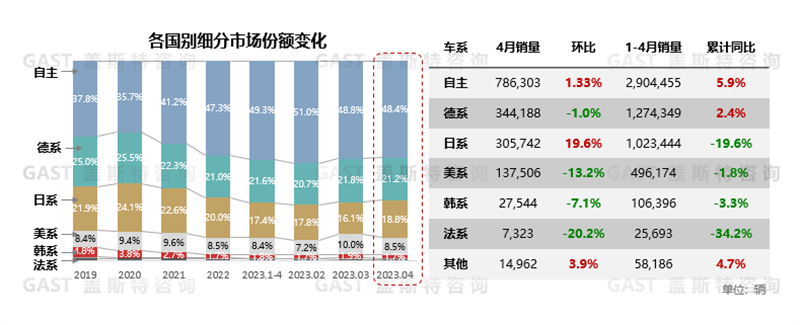4月,自主品牌份額相比上月下滑0.4%,德、美系份額略有下滑,日系由于各品牌燃油車終端優(yōu)惠大,份額提升2.7%。