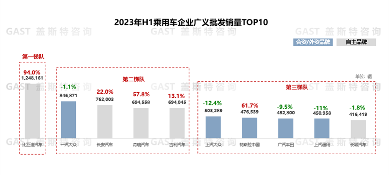 上半年,TOP10中自主品牌與合資/外資品牌各占5席,其中自主品牌占據(jù)TOP5中的4席。自主品牌中除長城外,均實現(xiàn)大幅增長;而合資/外資品牌中僅特斯拉實現(xiàn)同比正增長。從廠商排名來看,比亞迪穩(wěn)居第一梯隊,上半年陸續(xù)推出10款冠軍版車型疊加騰勢品牌強勢崛起,在主流市場和中高端市場均取得巨大銷量突破。一汽大眾主要受燃油車影響,上半年銷量同比小幅下滑。奇瑞在國內(nèi)國外銷量雙增長的帶動下,2023年以來穩(wěn)居第二梯隊。特斯拉Model Y/Model 3車型持續(xù)暢銷,上半年總銷量躋身第三梯隊位列第7位。上汽大眾/上汽通用、廣汽豐田等傳統(tǒng)合資車企受自主NEV產(chǎn)品沖擊,市場份額被進一步擠壓。長城NEV銷量不及預期,是TOP10中唯一銷量同比下滑的自主車企。