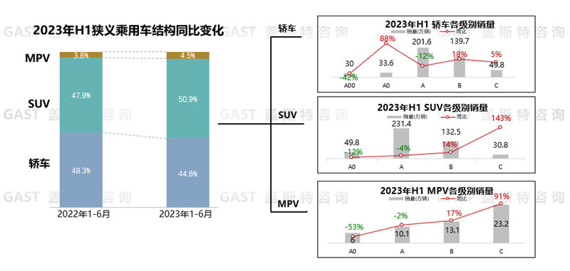 從三大品類市場份額看,上半年SUV市場份額進一步擴大,占比超過50%,超越轎車成為份額最大的乘用車品類;MPV份額小幅增長,轎車份額則下滑明顯。其中,SUV和MPV市場主要受到B、C級中高端新能源車型的拉動,轎車則主要受A00級微型新能源車型和A級燃油車下滑的影響。