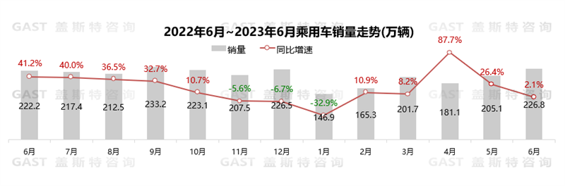 2023年6月,中國汽車市場銷售262.2萬輛,同比增長4.8%,環(huán)比增長10.1%;1-6月累計銷售1323.9萬輛,同比增長9.8%。近期中央與地方出臺一系列促消費政策,疊加車企半年度促銷活動及大量新車上市,市場需求逐步釋放,整體市場呈現(xiàn)持續(xù)回暖態(tài)勢。本報告圍繞2023年上半年中國車市銷量走勢進行研究分析。