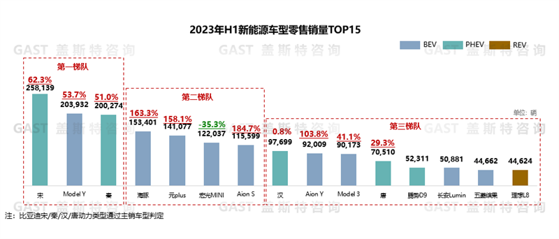 上半年自主品牌乘用車銷量達到470萬,份額達到49.5%。頭部車企與本土新勢力在NEV領域全市場、多技術路線布局,加速對各價格段燃油車取代,是自主品牌市場份額持續(xù)增長的主要原因。從各價格段來看,在30萬以上市場,理想、蔚來、騰勢等品牌加速搶占BBA市場;吉利銀河、極氪,長安深藍、長城梟龍等主攻15-25萬中高端市場;在15萬以下中低端市場,比亞迪海豚、埃安S/Y等滲透率持續(xù)提升。從技術路線布局來看,BYD、廣汽、長城等采用PHEV+EV雙輪驅(qū)動,零跑、哪吒、深藍等采用EV+REV路線,長安、吉利、奇瑞等則PHEV+REV+EV三條技術路線全面發(fā)力,加速新能源汽車在主流市場滲透。