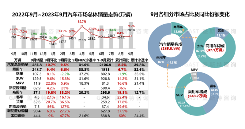 2023年9月,中國(guó)汽車市場(chǎng)銷售285.8萬輛車,環(huán)比增長(zhǎng)10.7%,同比增長(zhǎng)9.5%;1-9月累計(jì)銷售2106.9萬輛,同比增長(zhǎng)8.2%,整體市場(chǎng)延續(xù)復(fù)蘇態(tài)勢(shì)。受國(guó)家和地方促消費(fèi)政策持續(xù)和車企進(jìn)一步加大促銷力度影響,9月銷量繼續(xù)保持同環(huán)比雙增長(zhǎng)。本報(bào)告圍繞9月份中國(guó)車市銷量走勢(shì)進(jìn)行研究分析。