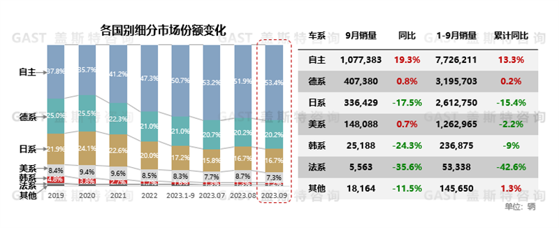9月自主品牌份額環(huán)比有較大幅度回升,總體份額達(dá)到53.4%,再次刷新歷史最高值。其中,自主品牌和新勢(shì)力加快戰(zhàn)略車型發(fā)布節(jié)奏,在主流市場(chǎng)和中高端市場(chǎng)推出多款高競(jìng)爭(zhēng)力產(chǎn)品,且車型售價(jià)普遍低于預(yù)期,進(jìn)一步鞏固市場(chǎng)份額。合資和外資品牌中,德系和日系品牌促銷政策繼續(xù)保持高位,環(huán)比份額較上月保持不變;美系受到特斯拉改款影響,整體份額下滑1.4個(gè)百分點(diǎn)。
