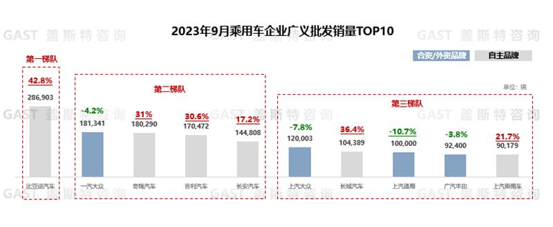 9月,TOP10中自主品牌占據(jù)6席,且多數(shù)品牌同比增幅超過20%。從廠商排名來看,比亞迪持續(xù)同比高增長(zhǎng)態(tài)勢(shì),9月銷量再創(chuàng)新高,達(dá)到28.7萬輛,繼續(xù)保持?jǐn)鄬邮筋I(lǐng)先;1-9月總銷量突破200萬輛,已超過2022年全年銷量總和。一汽大眾延續(xù)燃油車降價(jià)補(bǔ)貼政策,環(huán)比銷量增長(zhǎng)20%,排名由上月的第四位升至第二位。奇瑞延續(xù)出口強(qiáng)勢(shì)表現(xiàn),同比增幅超過30%,但總體新能源銷量占比仍不足10%。吉利新能源車型持續(xù)發(fā)力,9月新能源銷量達(dá)到5.4萬輛,新能源銷量占總銷量比例超過30%。上汽大眾燃油車和新能源車型同步采取降價(jià)補(bǔ)貼政策,同比降幅進(jìn)一步收窄。長(zhǎng)城9月新能源銷量突破2萬輛,成為新的增長(zhǎng)點(diǎn)。上汽乘用車在出口市場(chǎng)和新能源市場(chǎng)同步發(fā)力,單月銷量進(jìn)入TOP10,而特斯拉受改款影響排名跌出TOP10。