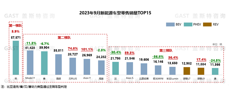 9月,新能源乘用車銷量TOP15車型中,比亞迪占據(jù)7席,且TOP8中有6款車型來自比亞迪;從同比增幅看,元PLUS、AION Y和AION S增幅較大。從具體車型來看,宋家族穩(wěn)居首位,其中宋PLUS連續(xù)兩月保持近10%增長(zhǎng),銷量領(lǐng)先優(yōu)勢(shì)進(jìn)一步擴(kuò)大。Model Y連續(xù)兩月銷量突破4萬輛,但受到去年同期基數(shù)較高影響,同比出現(xiàn)較大幅度下滑。元PLUS老款車型降價(jià)優(yōu)惠,加上冠軍版車型上市,銷量較上月增長(zhǎng)4000輛。AION Y延續(xù)補(bǔ)貼和限時(shí)免息金融方案,銷量穩(wěn)定保持在2.5萬輛以上。五菱繽果釋放最新優(yōu)惠政策,銷量較上月增長(zhǎng)近6000輛。新勢(shì)力中,理想共兩款車型上榜,其中L9再次進(jìn)入TOP15。