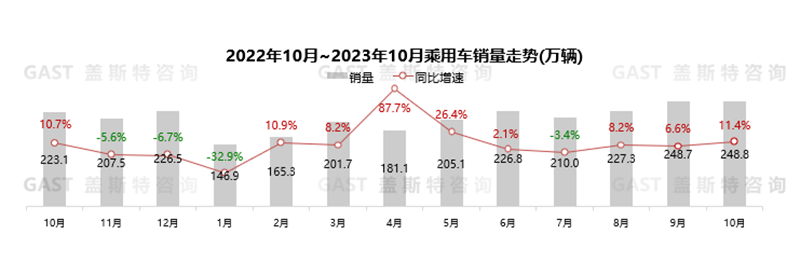 10月,乘用車銷量環(huán)比微增,同比保持較大幅度增長(zhǎng);商用車環(huán)比銷量有所下滑,但同比增幅依舊保持超30%增長(zhǎng);出口和新能源市場(chǎng)延續(xù)高增長(zhǎng)態(tài)勢(shì),單月出口量和新能源銷量再次刷新歷史高值,成為整體市場(chǎng)的主要增量。