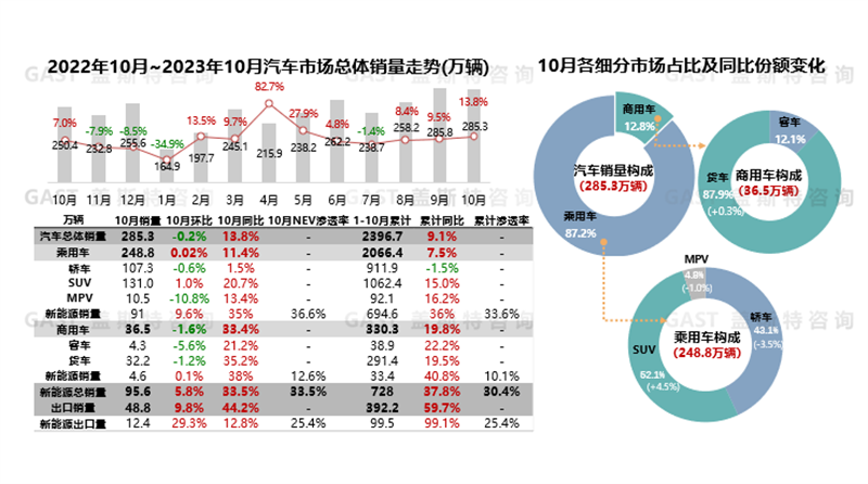 2023年10月,中國(guó)汽車市場(chǎng)銷售285.3萬輛,環(huán)比下降0.2%,同比增長(zhǎng)13.8%;1-10月累計(jì)銷售2396.7萬輛,同比增長(zhǎng)9.1%。 受到車企促銷力度延續(xù)和新品供給速度加快影響,10月整體市場(chǎng)延續(xù)9月良好復(fù)蘇勢(shì)頭,環(huán)比銷量基本持平,同比銷量大幅增加。本報(bào)告圍繞10月份中國(guó)車市銷量走勢(shì)進(jìn)行研究分析。