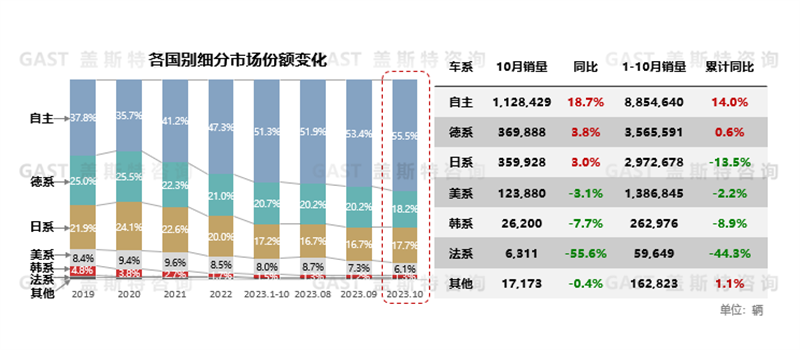 10月自主品牌銷量同環(huán)比均實(shí)現(xiàn)較大幅度增長(zhǎng),單月市場(chǎng)份額環(huán)比增長(zhǎng)2.1個(gè)百分點(diǎn),首次突破55%。其中,自主品牌新能源新品投放速度持續(xù)加快,單月新能源銷量占總體自主品牌銷量的比例再次突破50%,進(jìn)一步加速搶占合資和外資品牌燃油車市場(chǎng)份額。合資和外資品牌中,日系燃油車降價(jià)促銷持續(xù)保持高位,需求短暫回升,銷量和市場(chǎng)份額環(huán)比均有小幅回升;美系受到特斯拉改款影響,同環(huán)比銷量均有一定下滑,整體份額已連續(xù)兩個(gè)月下滑。