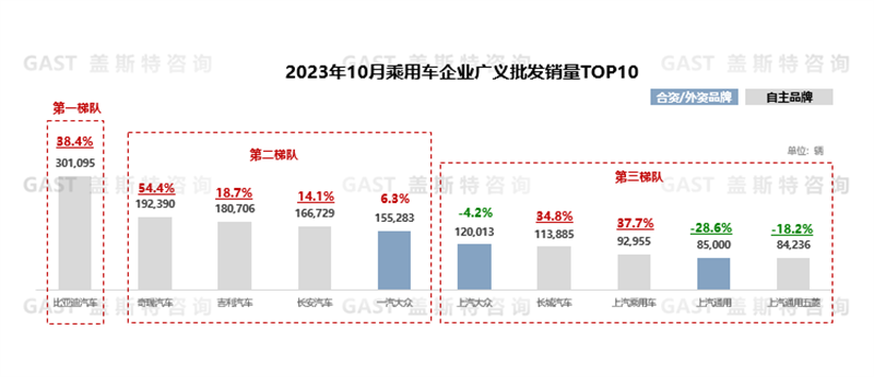 10月,TOP10中自主品牌占據(jù)7席,且前4名均為自主品牌。從具體廠商排名來看,比亞迪延續(xù)同環(huán)比雙增長(zhǎng)態(tài)勢(shì),單月銷量首次突破30萬輛,1-10月累計(jì)銷量達(dá)到237萬輛;奇瑞延續(xù)出口強(qiáng)勢(shì)表現(xiàn),單月出口量超過9萬輛,排名上升至第二位;吉利和長(zhǎng)安NEV轉(zhuǎn)型速度持續(xù)加快,兩個(gè)品牌NEV銷量占總銷量的比例均超過34%;一汽大眾受到奧迪品牌批發(fā)量大幅下滑影響,整體銷量排名下滑至第五位。長(zhǎng)城在新能源和海外市場(chǎng)保持雙線發(fā)力,單月銷量同比增長(zhǎng)34.8%。上汽乘用車中名爵品牌單月出口量超過6萬輛,整體銷量排名上升至第8位。上汽通用五菱受到繽果銷量增長(zhǎng)拉動(dòng),排名再次進(jìn)入TOP10。