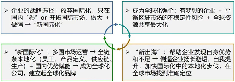 “新出?!眲荼赝ㄏ颉靶聡H化”,其內(nèi)涵是:企業(yè)借助國內(nèi)優(yōu)勢賦能海外發(fā)展,通過在多國市場上深耕,逐步實現(xiàn)包括員工、產(chǎn)品定義、生產(chǎn)及供應(yīng)鏈等在內(nèi)的全鏈條各環(huán)節(jié)的本地化,最終成為一家全球化的跨國公司,并逐步建立起全球化的品牌。