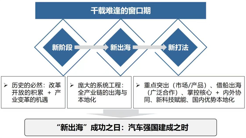 最后,對今天的分享做一個總結(jié)。我認為,正是由于中國汽車產(chǎn)業(yè)發(fā)展進入了“新階段”,我們才具備了“新出?!钡幕A(chǔ)和可能,并迎來了千載難逢的窗口期;而為了做好“新出?!本捅仨毑扇 靶麓蚍ā?,這樣才能確保中國車企在全球范圍內(nèi)取得新的成功,并最終實現(xiàn)更大的發(fā)展。從這個意義上講,“新出?!笔侵袊Q生世界級跨國車企的必答題,這個問題的答案將決定未來中國汽車產(chǎn)業(yè)如何影響和引領(lǐng)世界。
