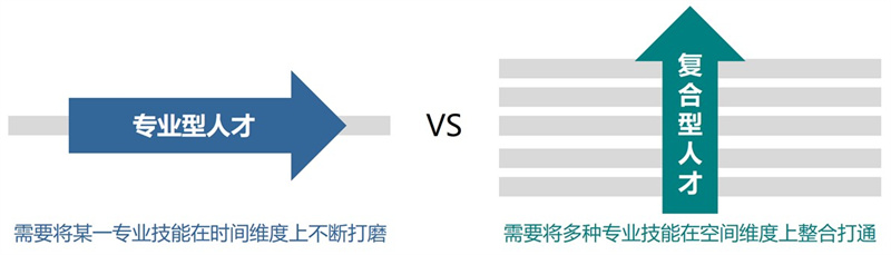 然而隨著產(chǎn)業(yè)乃至整個社會進(jìn)入到全新的發(fā)展階段,我覺得這種劃分方式已經(jīng)不夠科學(xué)了,我們需要重新定義復(fù)合型人才。在我看來,復(fù)合型人才與專業(yè)型人才的真正區(qū)別在于,能否從思維方式和認(rèn)知模式上突破專業(yè)領(lǐng)域的限制來進(jìn)行思考、判斷和決策。就是說,復(fù)合型人才必須具有更寬的眼界、視野和更高的思維層次,能夠?qū)π聦I(yè)、新領(lǐng)域的知識觸類旁通,并能將跨專業(yè)、跨領(lǐng)域的知識和經(jīng)驗(yàn)進(jìn)行整合以達(dá)到融會貫通,從而形成從本質(zhì)出發(fā)、系統(tǒng)性地看待問題和解決問題的核心能力。如果說專業(yè)型人才需要將某一專業(yè)技能在時間維度上不斷打磨,以積累提升;那么復(fù)合型人才則需要將多種專業(yè)技能在空間維度上整合打通,以靈活應(yīng)對復(fù)雜多變的世界(參見圖1)。