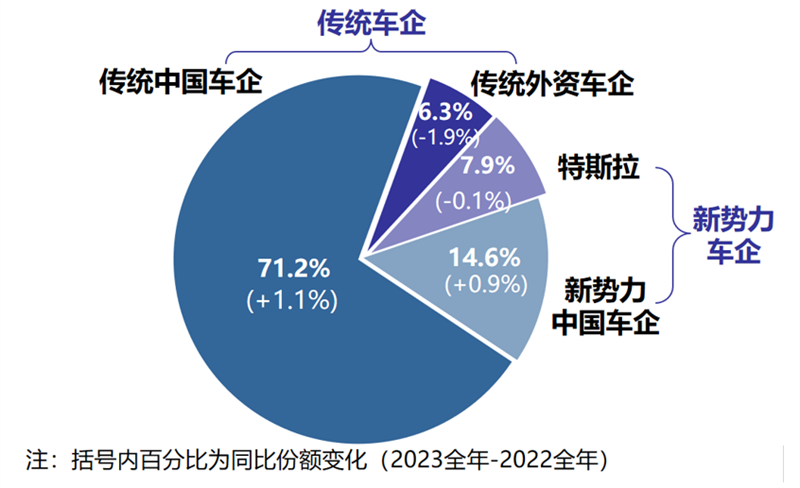 從新能源汽車市場來看,如圖2所示,中國車企的優(yōu)勢更為突出:2023全年,中國車企在國內(nèi)新能源乘用車市場上占據(jù)了85.8%的份額。一方面,傳統(tǒng)車企開始競相發(fā)力,比亞迪成為全球新能源汽車銷量冠軍,廣汽埃安年銷量超48萬輛,賽力斯憑借下半年新上市的問界新車型實現(xiàn)了銷量的現(xiàn)象級激增,此外像吉利極氪、長安深藍(lán)、東風(fēng)嵐圖、上汽智己等新品牌也都取得了不錯的業(yè)績。另一方面,新勢力車企的發(fā)展有起有落,不過總體份額也較去年有所增長,新能源乘用車市占率達(dá)到了14.6%,其中理想汽車的表現(xiàn)最為亮眼,以37.6萬輛的年銷量率先突破了30萬輛的規(guī)模效益門檻,其12月的銷量甚至超過了5萬輛。