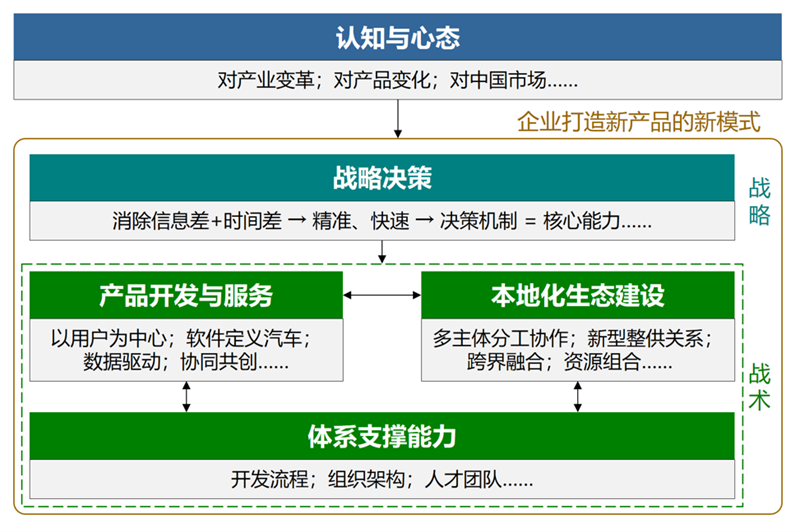 三要逐一落實各項關(guān)鍵舉措。一是構(gòu)建本土化的快速決策機制:包括中國分部與總部互動快,與本土伙伴合作緊密,根據(jù)本地產(chǎn)業(yè)政策、市場、競爭對手等情況快速定義和調(diào)整產(chǎn)品戰(zhàn)略,有效利用好本土資源以快速開發(fā)及導(dǎo)入產(chǎn)品,并確保產(chǎn)品迭代優(yōu)化與精準(zhǔn)服務(wù)的快速落地。一句話,產(chǎn)品從定義、策劃到開發(fā)、服務(wù)全過程的快速實現(xiàn)是決勝的關(guān)鍵。二是平衡好全球開發(fā)與本土開發(fā):對于基礎(chǔ)性的硬件平臺和通用性的軟件架構(gòu),在充分考慮中國市場上產(chǎn)品的競爭力乃至實現(xiàn)引領(lǐng)的前提下,由總部協(xié)調(diào)資源進(jìn)行全球統(tǒng)一開發(fā);而對于直接與用戶體驗相關(guān)的應(yīng)用軟件,則必須由中國的開發(fā)團(tuán)隊聯(lián)合本地的生態(tài)伙伴,基于本地的場景和數(shù)據(jù),進(jìn)行“本地化”開發(fā)與迭代。在此過程中,尤其要重視本地數(shù)據(jù)中心和在線服務(wù)能力的建設(shè)。三是積極構(gòu)建、有效接入、充分利用中國本地生態(tài):包括整合集成技術(shù)生態(tài)、構(gòu)建應(yīng)用生態(tài)(開發(fā)者生態(tài))、接入服務(wù)資源生態(tài)等。未來汽車產(chǎn)品的競爭力在很大程度上取決于企業(yè)對生態(tài)資源的整合和利用能力,為此,必須謀求與本地供應(yīng)商建立起長期的戰(zhàn)略合作伙伴關(guān)系。四是強化體系化支撐能力:通過開發(fā)流程與組織架構(gòu)的創(chuàng)新,以及包含企業(yè)內(nèi)外部資源的本地優(yōu)秀人才(尤其是軟件方面)的培育及使用,來支撐企業(yè)的戰(zhàn)略決策、產(chǎn)品開發(fā)與服務(wù)、本地化生態(tài)建設(shè)等各項關(guān)鍵舉措的落地。