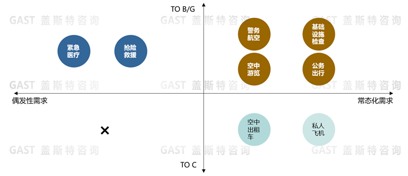 一是,ToB/ToG的偶發(fā)性需求,例如商業(yè)運(yùn)營中特需情況下的載人載物,或政府服務(wù)中的緊急醫(yī)療、搶險(xiǎn)救援等情況時(shí),飛行汽車的出行效率高于汽車,同時(shí)成本低于直升機(jī);