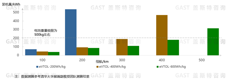 當(dāng)電池能量密度達(dá)到200Wh/kg時(shí),僅能支持eVTOL續(xù)航100公里左右,此時(shí)所需電池容量為70kWh。若eVTOL需要續(xù)航200公里,則需電量超500kWh。按照每度電對(duì)應(yīng)電池質(zhì)量約5kg計(jì)算,意味著需要2.5噸電池,而eVTOL上電池質(zhì)量極限是500kg,顯然如此能量密度比的電池?zé)o法滿足eVTOL續(xù)航要求。