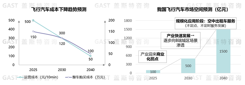 飛行汽車市場(chǎng)規(guī)模由三部分構(gòu)成:整車銷售規(guī)模、相關(guān)產(chǎn)業(yè)鏈規(guī)模及服務(wù)運(yùn)營收入。整車銷售方面,預(yù)計(jì)2025年中國飛行汽車市場(chǎng)規(guī)模約800臺(tái)、2030年約2000臺(tái)、2040年將超5000臺(tái)。結(jié)合飛行汽車商業(yè)化路徑下的核心應(yīng)用場(chǎng)景、產(chǎn)品成本及運(yùn)營成本趨勢(shì)、未來市場(chǎng)規(guī)模等各種因素,蓋斯特預(yù)測(cè):中國飛行汽車的產(chǎn)業(yè)產(chǎn)值將在2025年、2030年和2040年分別達(dá)到100億、500億和1500億元。