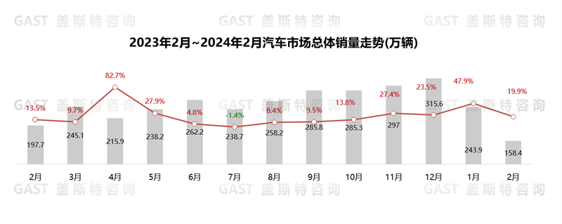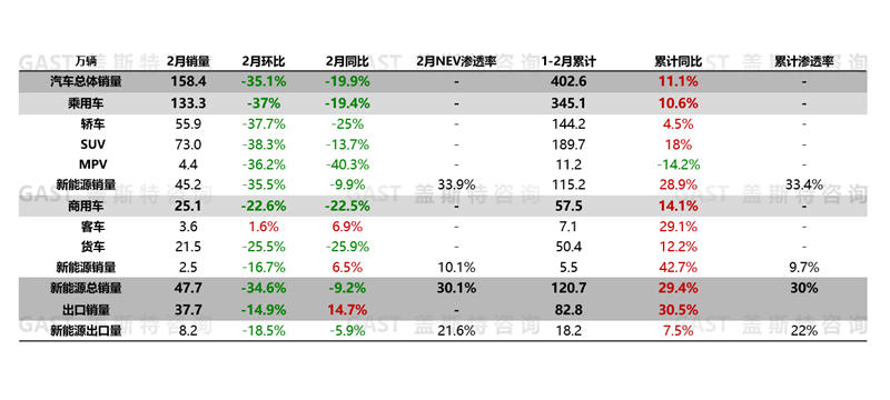 2月,中國(guó)汽車市場(chǎng)銷售158.4萬輛,同比下降19.9%,環(huán)比下降35.1%。購車需求節(jié)前已釋放,疊加春節(jié)假期影響,2月整體市場(chǎng)活躍度下滑,同環(huán)比均有較大幅度回落。