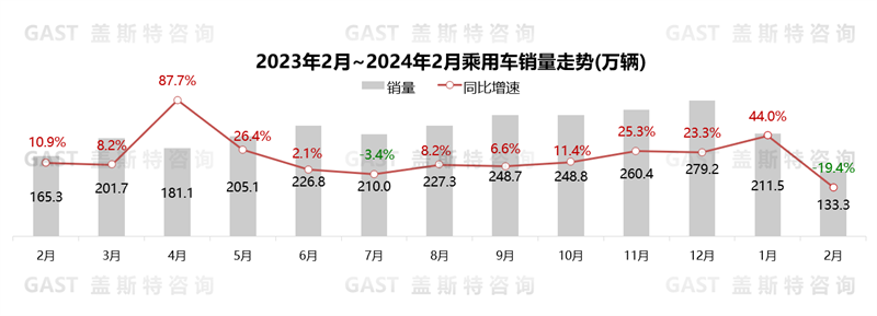 2月,乘用車市場(chǎng)銷售133.3萬輛,同比下降19.4%,環(huán)比下降37%。供給方面,廠商促銷活躍,改款及新車型加快推新,產(chǎn)品供給豐富。消費(fèi)方面,春節(jié)前部分消費(fèi)需求提前釋放,且價(jià)格戰(zhàn)進(jìn)一步升級(jí),消費(fèi)者觀望情緒加強(qiáng)。