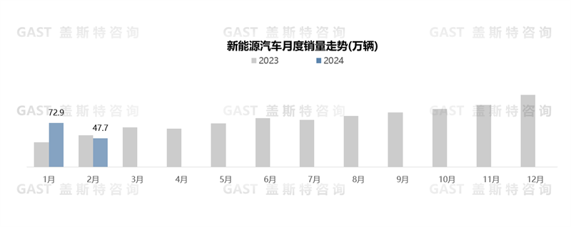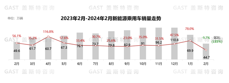 2月,新能源乘用車?yán)塾?jì)銷售44.7萬輛,同比下降9.7%,環(huán)比下降35%。由于春節(jié)假期影響新車交付、本輪價(jià)格戰(zhàn)NEV車型降價(jià)幅度進(jìn)一步擴(kuò)大導(dǎo)致消費(fèi)者持幣觀望,NEV單月銷量處于最近一年的最低點(diǎn)。