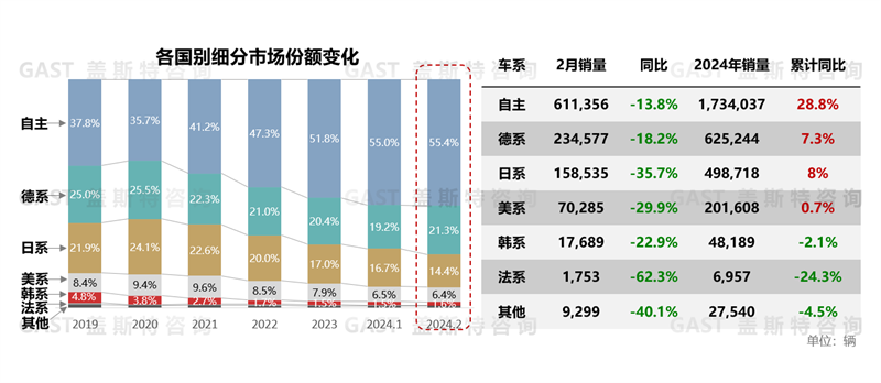 市場(chǎng)份額角度,2月自主份額達(dá)到55.4%,較上月提升0.4個(gè)百分點(diǎn),已連續(xù)兩個(gè)月突破55%。日系主銷燃油車受自主插混車型強(qiáng)烈沖擊,份額環(huán)比有較大幅度下滑。