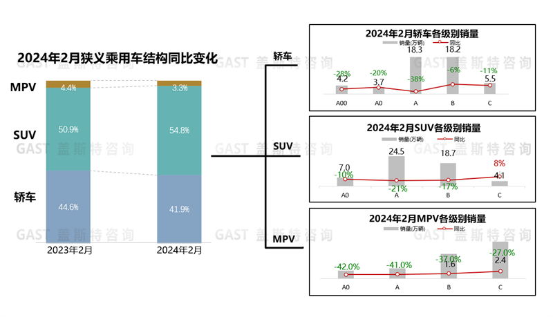 轎車份額為41.9%,同比下滑2.7個(gè)百分點(diǎn),較2023年整體降幅有所收窄。A00級(jí)車型需求進(jìn)一步萎縮;A級(jí)降幅最大,10萬級(jí)家轎市場(chǎng)價(jià)格波動(dòng)相對(duì)更大,消費(fèi)者觀望情緒更強(qiáng)烈;B級(jí)與C級(jí)同比降幅最小。