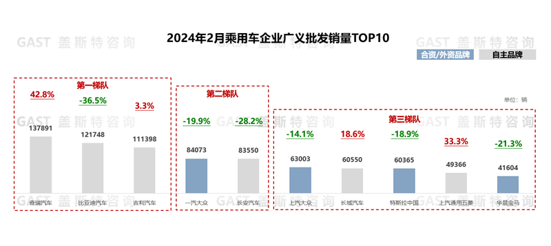 2月,TOP10中自主品牌占據(jù)6席,且前3名均為自主品牌。具體來看,奇瑞:海外市場(chǎng)受春節(jié)假期影響小,同比增幅超50%;比亞迪:旗下2024款主銷車型待上市,銷量出現(xiàn)大幅下滑;吉利:NEV銷量同比大幅增加,整體穩(wěn)中有升;一汽大眾:受主銷車型銷量下滑影響,同比下滑近20%,整體銷量已跌破9萬輛;長(zhǎng)城:新能源與海外市場(chǎng)同步發(fā)力,同比實(shí)現(xiàn)兩位數(shù)正增長(zhǎng);特斯拉:受整體市場(chǎng)銷量下滑與競(jìng)爭(zhēng)加劇的影響,單月銷量創(chuàng)近14個(gè)月新低。