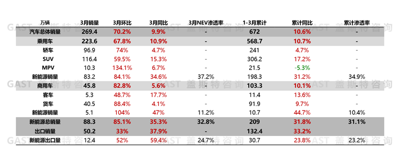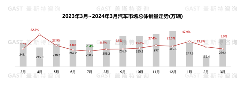 3月,中國(guó)汽車市場(chǎng)銷售269.4萬(wàn)輛,同比增長(zhǎng)9.9%,環(huán)比增長(zhǎng)70.2%。春節(jié)過(guò)后車企促銷力度加大,疊加國(guó)家及各地方以舊換新政策陸續(xù)推出,3月整體市場(chǎng)活躍度顯著提升,環(huán)比實(shí)現(xiàn)大幅度增長(zhǎng)。