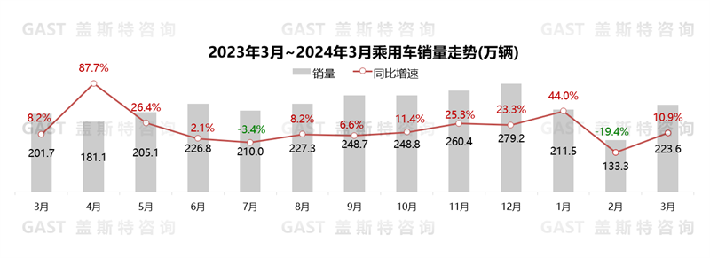 3月,乘用車市場(chǎng)銷售223.6萬(wàn)輛,同比增長(zhǎng)10.9%,環(huán)比增長(zhǎng)67.8%。政策方面,國(guó)家及各地方政府陸續(xù)出臺(tái)以舊換新政策。供給方面,節(jié)后各車企新車型發(fā)布速度加快,同時(shí)部分車企通過(guò)推出入門版車型拉低現(xiàn)有車型購(gòu)車門檻。消費(fèi)方面,春節(jié)期間積壓的消費(fèi)需求全面恢復(fù),價(jià)格戰(zhàn)引發(fā)消費(fèi)者購(gòu)車需求在三月下旬集中釋放。