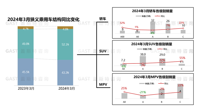 SUV份額為52.1%,同比增長(zhǎng)2.3個(gè)百分點(diǎn)。A0級(jí)同比下滑,ICE車型銷量下滑較大;A級(jí)、B級(jí)、C級(jí)市場(chǎng)依靠新能源產(chǎn)品拉動(dòng),均實(shí)現(xiàn)同環(huán)比雙增長(zhǎng)。